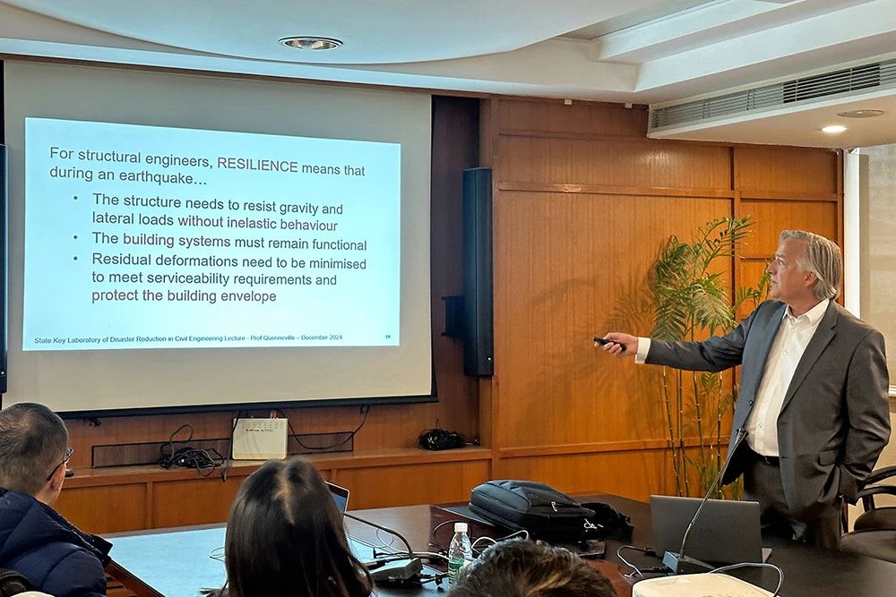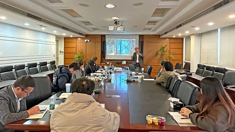 Quenneville教授作了题为《Seismic design of resilient structures —— a perspective》的学术报告,报告中介绍了韧性摩擦自复位阻尼器的最新研究进展,以及无损伤建筑结构建造和低损伤既有结构加固技术的工程应用案例。结构所副所长冷予冰介绍了上海建科院的科技创新与发展情况,以及在工程结构抗震韧性领域开展的研究与技术服务。参会人员与Quenneville教授围绕自复位结构及消能减震技术研究进行了深入交流。