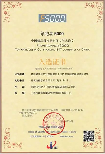 研究成果“套筒灌浆缺陷对预制混凝土柱抗震性能影响的试验研究”入选2023年度(2024年公布)F5000论文。该论文由实验室固定人员肖顺博士、主任李向民教高、学术带头人许清风教高、同济大学蒋欢军教授、实验室固定人员高润东博士、学术带头人王卓琳教高共同完成,发表在2022年《建筑结构学报》第43卷第5期,112-121页。“领跑者5000(Frontrunner 5000, 简称F5000)”是中国科学技术信息研究所受科技部委托开展的“精品科技期刊战略”项目。中国科学技术信息研究所从中国精品科技期刊中评选出各学科年度前1%的高被引论文,每一个期刊入选论文不超过20篇。数据来源://f5000.istic.ac.cn/reveal-paper